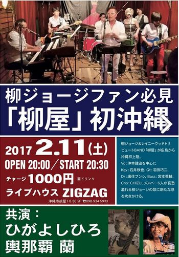 広島のバンド「柳屋」のライブが沖縄市でライブをするそうです。